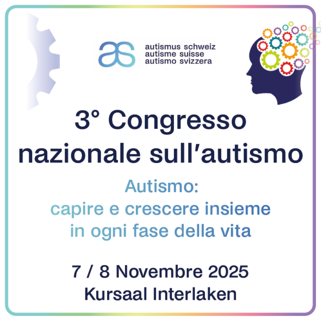 3° Congresso nazionale sull’autismo Autismo: capire e crescere insieme in ogni fase della vita Care famiglie, soci e amici di autismo svizzera, il 3° Congresso nazionale sull’autismo si terrà a Interlaken il 7/8 novembre 2025. Questa volta sarà trasmesso anche online. Siamo lieti di invitarvi a questo evento, che si svolge solo ogni tre o…